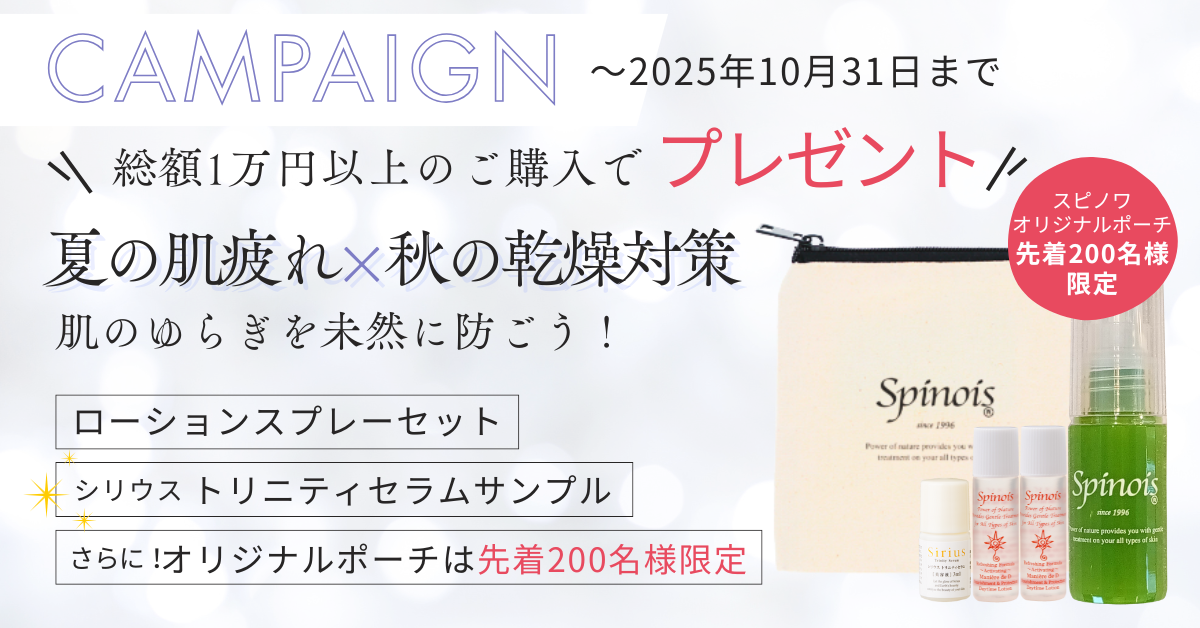お客様体験談ページにK.K様からのコメント『これからも健康な肌を目指して、スピノワでお手入れしていきます』をアップしました。 - 2024-5-14突然の湿疹!毛虫・チャドクガによる皮膚炎にご注意下さい。詳しくはこちら